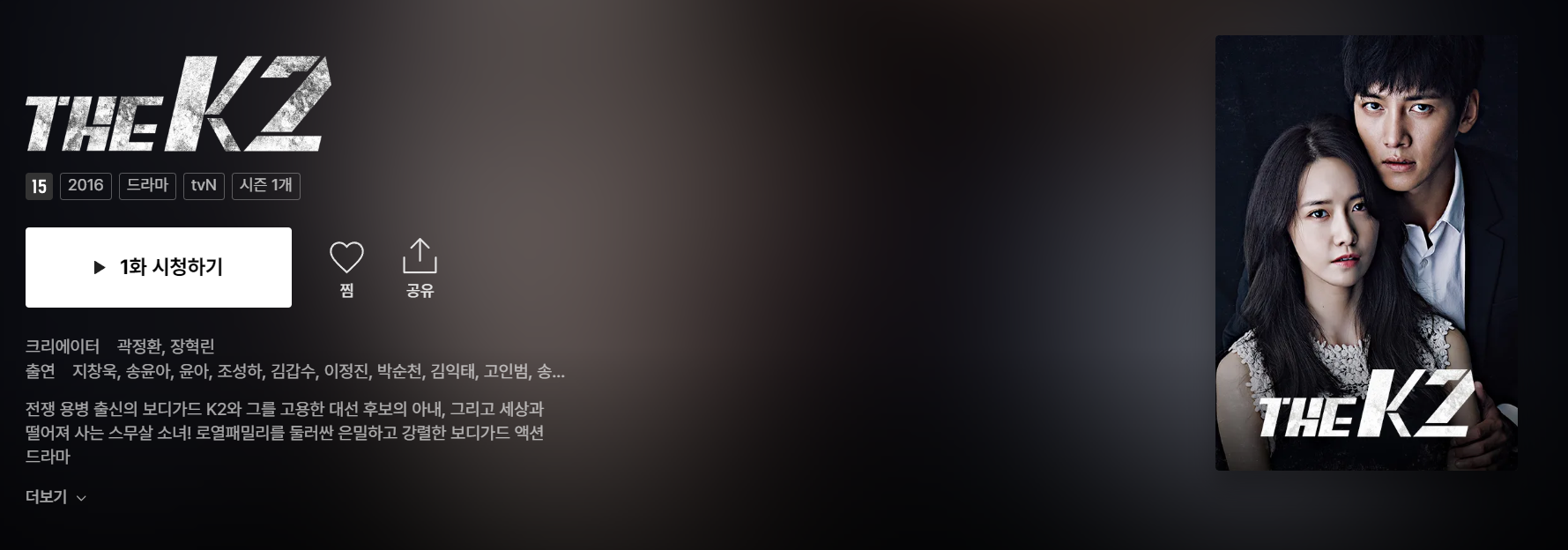개인적으로 좋아하는 지창욱의 작품 추천작 두 번째 k2입니다. 개인적으로 좋아하지만 개인사로 인해 크게 인정받지 못하는 송윤아 배우님이 출현하셔서 더욱 안타까웠던 작품으로 임윤아와의 로맨스도 로맨스지만 송윤아 배우님의 연기가 역시나 볼만했던 드라마 THE K2도 추천드립니다.