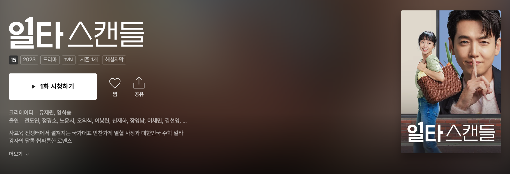 오랜만에 안방극장으로 컴백한 전도연과 슬기로운 의사생활 및 다량의 작품으로 연기력을 인정받은 정경호의 케미가 돋보이는 드라마 일타 스캔들. 추리 스릴러가 약간은 가미된 드라마로 추리와 함께 보면 재미있으므로 추천드립니다.