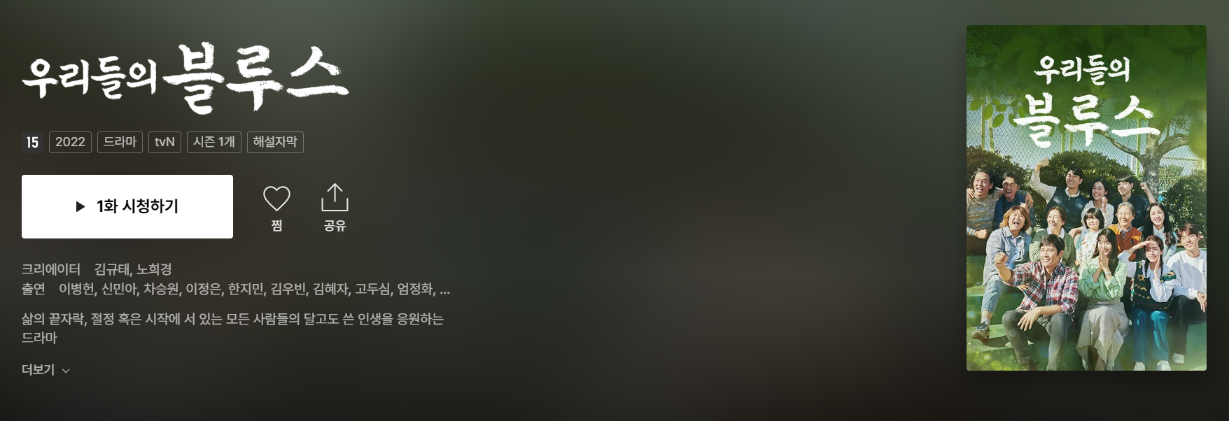 초호화 출현진들로 인해 방영 전부터 기대감이 폭발했던 드라마로 역시나 놓칠 부분이 없던 드라마로 각각의 짧은 에피소드들이 하나의 큰 줄기가 되어가는 방식이 흥미로웠던 드라마 우리들의 블루스 역시 추천드립니다.
